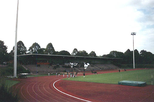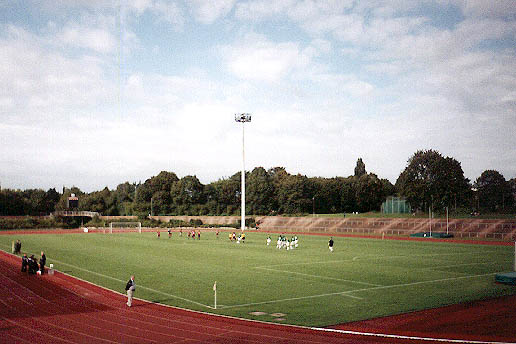 Raus aus dem Stadion, rein ins Stadion. Herrlich dieser Doppler. Ganze 2 min. nach verlassen des letzten Grounds betrat man den nächsten: das Grenzlandstadion. Ein altes weitläufiges Ding, das zum Teil in den Kurven schon mit Grünzeug bewachsen ist. Blickfang ist auch hier ohne Frage die überdachte Sitzplatztribüne. Ansonsten hat dieses Schätzchen nicht allzuviel zu bieten; die Verköstigung läßt auch zu Wünschen übrig. Die Begegnung endet nach schwachem Spiel mit 0-1 für die Gäste, welche von ca. 10 Mitgereisten und ihren nervigen Trommeln unterstützt werden. Auch der heimische Anhang fällt gegen Ende des Spiels sowohl akkustisch als auch optisch (durch 4 große Schwenkfahnen) auf. Mit dem Schlußpfiff setzt Regen ein, welcher unsere Reisegruppe zu einem kleinen Lauf bewegt.