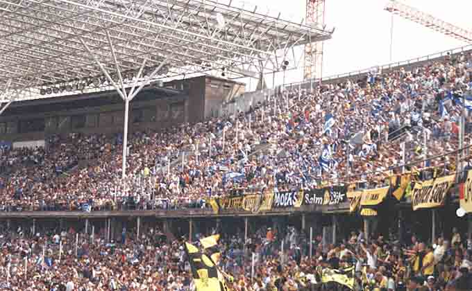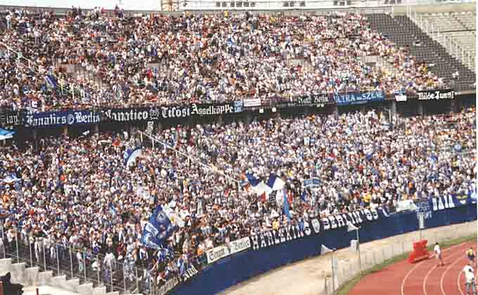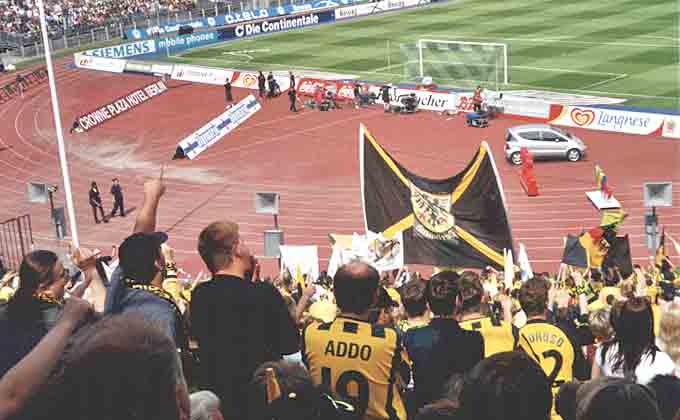 Nach dem Reinfall von Donetzk (Hochwasserterror in Polen, kurzfristige Aussortierung aus dem Mannschaftsflieger, dadurch keine Chance mehr ein Visum zu bekommen) (Anmerkung: Daumen hoch) ging es zusammen mit Ingo, Arthur und Zoschke zum 1. Auswärtsspiel unserer Borussia. Eigentlich gibt es nix besonderes über diese Partie zu berichten. Trotz mäßiger Leistung konnte dieser Auswärtssiegeingefahren werden. Dabei zeigte sich abermals die Stärke der neuerworbenen Sturmkräfte. Stimmungsmäßig bot das Berliner Publikum noch weniger als in den Jahren zuvor. Sorry, aber eure Heimspiele sind noch um Längen ätzender als unsere. Beim Dortmunder Anhang entwickelte sich während des Spieles eine ganz ordentliche, abwechslungsreiche Stimmung. Dabei machte allerdings meistens nur 1/4 des Blockes mit.