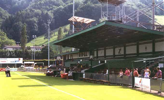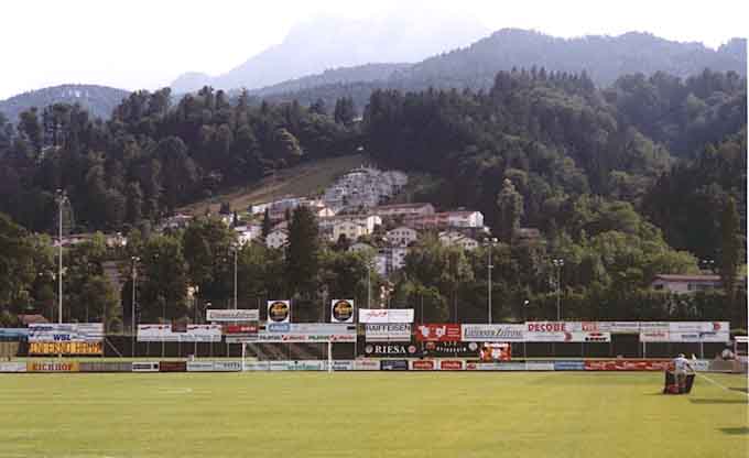 Gegen 10 Uhr hielt es dann auch der letzte von uns im Auto nicht mehr aus. Während es Öhli und Moritz in die Stadt verschlug, stattete ich mit Nico dem an das Stadion angrenzende Freibad einen Besuch ab, um ein wenig Sport zu treiben und den weiblichen Genüssen zu fröhnen. (die einen schon am Vorabend in Sion entzückt hatten). Am Nachmittag traf man die beiden anderen dann wieder zusammen mit 2 Meppenern. Der Weg ins Stadion verlief genauso erfolgreich wie 2 Tage zuvor. Zunächst ging es wieder zu unserer Stammbierbude und schenkte dem Spiel um Platz 3 zwischen Kriens und Frankfurt nicht allzuviel Beachtung. Das Endspiel schaute man sich dann doch in voller Länge an. Der BVB war total überlegen und ging mit 2-0 in Führung. Nach etwa einer halben Stunde wechselte der Luzerner Coach zur Wunderung aller Zuschauer die ganze Mannschaft aus. Das änderte doch nichts mehr an der Niederlage, die letztendlich mit 4-1 doch recht deutlich ausfiel. Bei der Abreise stellte man aufgrund der Lautstärke unseres Corsas den Blickfang im Stadionumfeld dar.