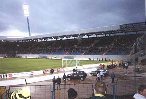 Im Gästeblock der Baustelle "Ostseestadion" fanden sich heute etwa 300 Gäste ein, davon ca. 200 aus dem Westen angereist. Das Stadion ist mitlerweile schon zur Hälfte fertig. Eine Hintertortribüne sowie eine Gerade sind praktisch schlüsselfertig und somit schon in Gebrauch. Die alte Haupttribüne ist zwar auch schon umgebaut, aber noch nicht bestuhlt. Lediglich die alte Gästekurve ist noch die gleiche wie früher, soll aber zum Jahreswechsel abgerissen werden. Obwohl somit nur 3 Tribünen zur Verfügugn standen war das Stadion nichmal annähernd ausverkauft. Wenn man die Zuschauerzahl mit deren früher vergleicht, kommt man zu der Vermutung, daß die Ossis nur zum Fußball gehen wenn sie auch naß werden können. Naja, anderes Thema. Die Stimmung im Gästeblock war heute ganz gut. Auf Rostocker Seite tat sich hingegen kaum etwas. Ein weiteres Phänomen, daß ohne Dach früher mehr Stimmung war als heuet mit Dach. Der BVB spielte ganz ordentlich und ging dann alssobald mit 0-2 in Führung. Anscheinend hatte nur unser aller Freund Jens L. etwas gegen einen Auswärtssieg. So probierte dieser gleich zweimal den Gegnern einen Strafstoß zu bescheren, was glücklicherweise nur einmal gelang. Auf dem Rückweg zum Auto geb es dann wieder die üblichen Pöbeleien, aber nix besonderes. Fazit: Gute Tour.