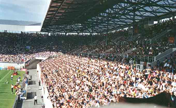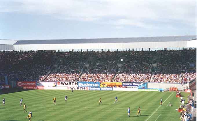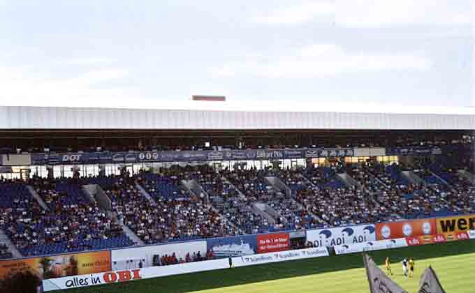 Stau, Stau, Stau!! Schon um 9 Uhr traf man sich mit Moritz, Mirko, Nico und Öhli am Rasthof Gütersloh. Danach folgte ein Stau nach dem anderen. So betrat man den Gästeblock ganze 20 min. nach Anstoß. So ein Dreck. Zu diesem Zeitpunkt führte der BVB bereits mit 0-2. Live im Stadion konnte man somit keine Tore mehr bestaunen. Das Ostseestadion ist nach dem Umbau ganz nett geworden. Es stellt eine Mischung aus der BayArena in Leverkusen und der Bauweise einiger holländischen Grounds dar. Trotzdem kommt kein allzu grosses Kommerzgefühl auf. Der Gästeblock war am heutigen Tage gut gefüllt, was nicht zuletzt daran lag, dass die Polizei das oberste Drittel des Blockes gesperrt hatten. (Sinnlos). Die Stimmung war streckenweise recht gut, was man von den Gastgebern nicht unbedingt behaupten kann. Ein dickes Minus verdiente sich hingegen die Stadionverköstigung. Bockwurst und Getränke an lediglich einem Schalter hinterm Gästeblock zu verkaufen ist ziemlich arm. Nach dem Spiel stand man noch eine zeitlang im Stau bevor man sein etap-Hotel in Schwerin erreichte. Dort wurde der Abend damit verbracht irgendwelche Hopper-Kino-Filme zu entwerfen. (z.B: "9 1/2 Grounds"; starring Festus oder "4 Ascheplätze und ein Länderpunkt")